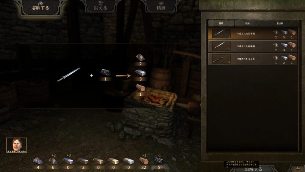 錬成した武器は自分のインベントリの中に入ってます。俺が錬成したブツは今持っている武器よりも弱く、しかもリーチも短いので作った意味はあまりない。(繰り返しますが…)今後、高Tierの武器錬成に入るために錬成知識のアンロックも必要なので、合間合間を見越して早めに錬成がらみのスキルを上げておくのがいいと思いますね。